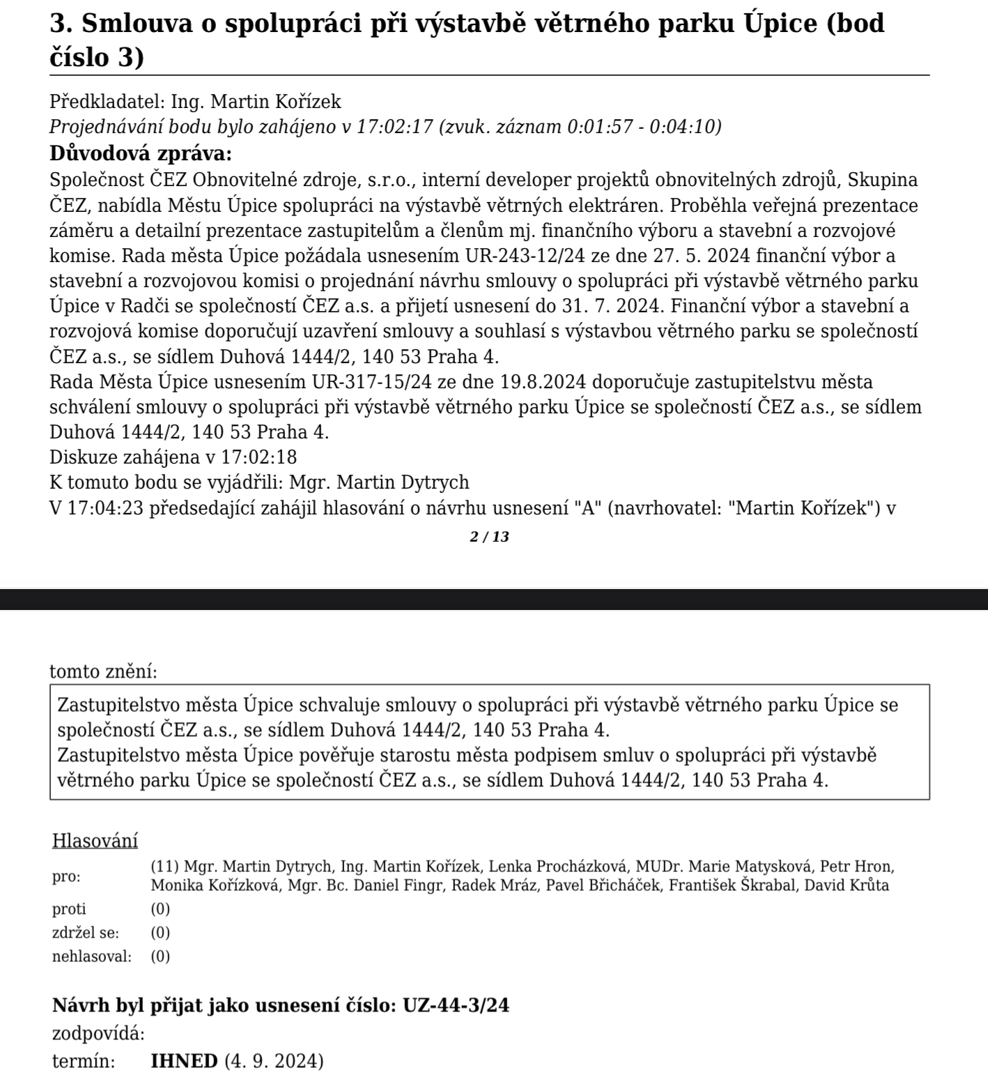 4.9.2024 bod 3) Smlouva o spolupráci při výstavbě větrného parku – Záznam ze zasedání zastupitelstva města.